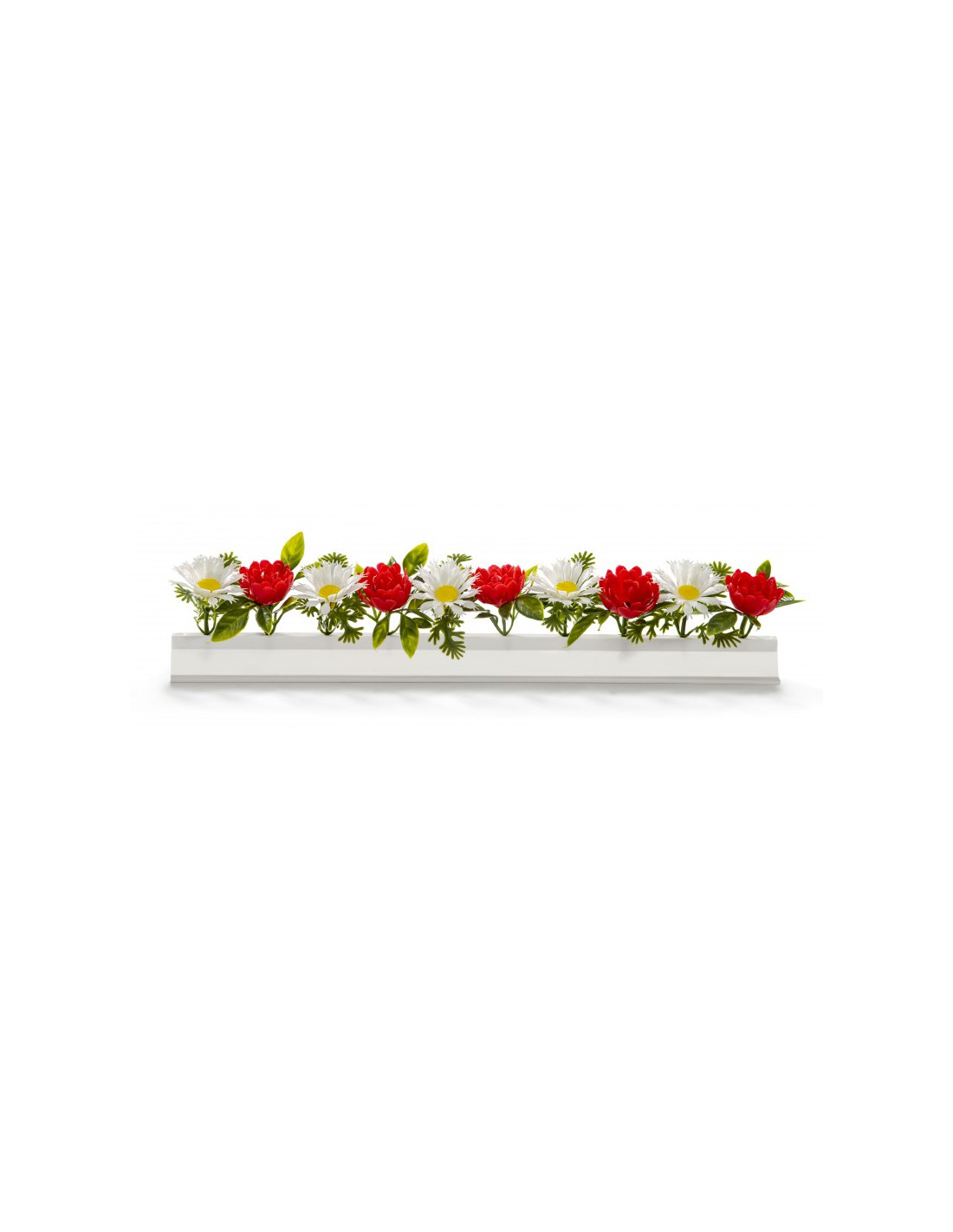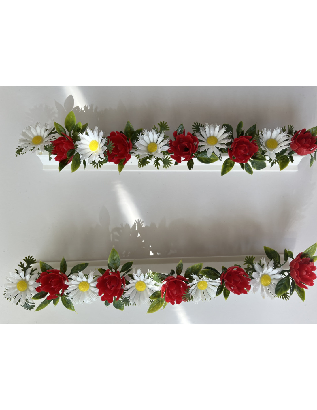 Barette roses et marguerites. Dimensions:+/- 5 cm x 25 cm de long avec socle blanc. Système de fixation inclus.